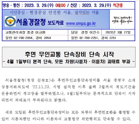 차량의 후면 번호판을 촬영하여 교통 법규 위반을 적발하는 후면 무인교통단속장비가 상봉지하차도에 22년 11월에 설치되었고, 다음 달 1일부터 단속이 시작됩니다. 이에 신호과속단속장비에 진입할 때는 물론 지나쳤을 때까지도 번호판이 촬영될 수 있습니다.